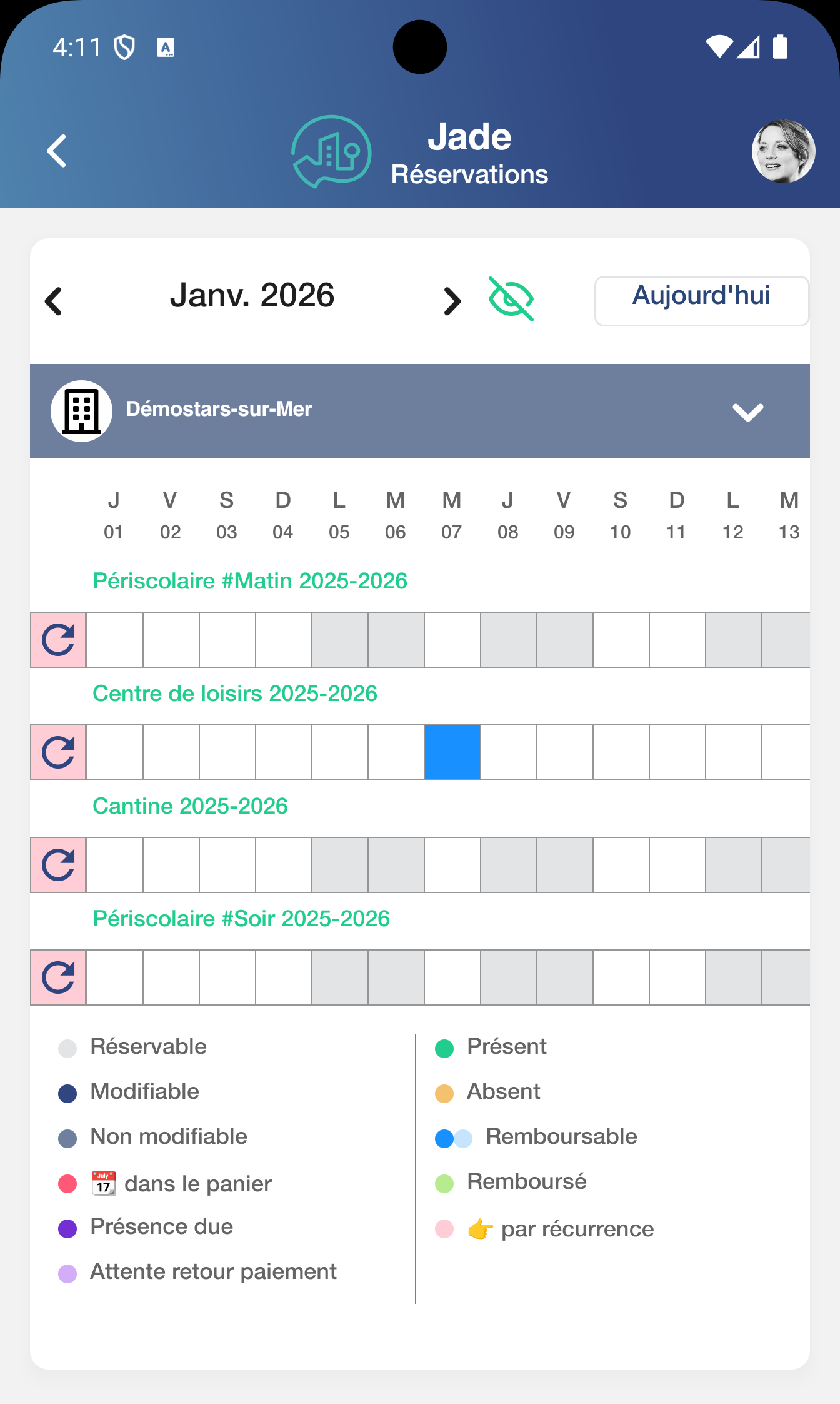 écran de réservation pour 1 seul enfant les activités pouvant être réservées pour l’enfant (fonction de ses inscriptions aux activités) sont regroupées par organisation